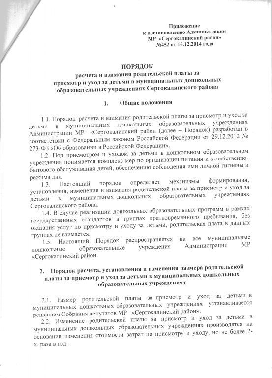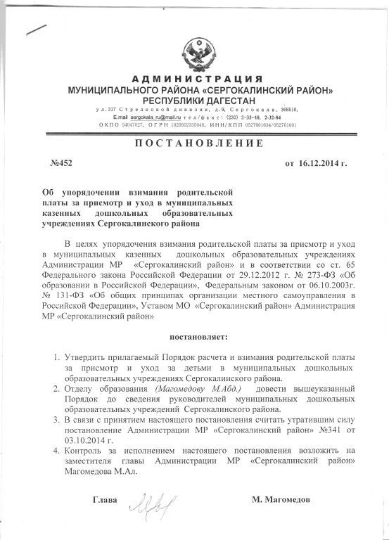 Документ об установлении размера платы, взимаемой с родителей (законных представителей)